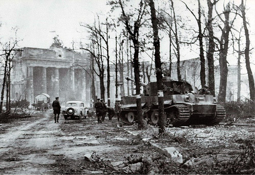 Tiger I belonging to Kampfgruppe ‘Kummersdorf’ seen at the Unter der Linden near to the Brandenburg Gate shortly after the fall of Berlin May 1945