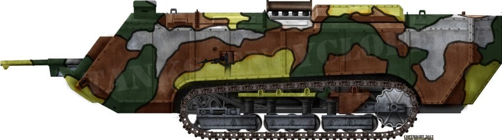 Their was armor which was from 6-15 mm of protection. The tank had 2 main cannons on the sides. Male variants would have Hotchkiss QF 6 pounder (57 mm) gun. It would also have 4 Hotchkiss air-cooled machine guns that are 7.62mm. The Female variants would have only 4 Vickers water-cooled machine guns and 1 Hotchkiss air-cooled machine gun both chambered in 7.62mm. The tank would have 8 crew but it would be troublesome as poor ventilation and heat from the engine made crew ill.