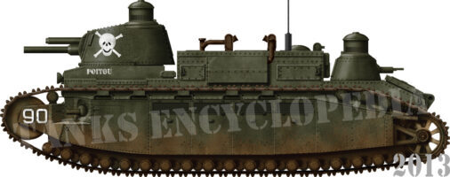 The Char 2C had 90mm of amour frontally and 65mm sided. The main gun was 75mm or 155 mm howitzer and had 4 smaller guns which were Hotchkiss 8x50mmR Lebel machine guns. Only ten were ever produced.